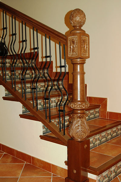 Arranque Modelo Tallado Estilo Castellano con pilastra ricamente decorada con motivos clásicos. Desde su base cuadrada, sobre la que se aprecian hojas de acanto cuidadosamente talladas, hasta su parte superior, rematada en forma de piña.